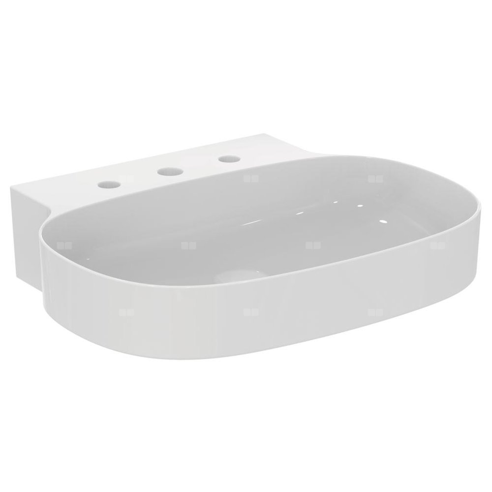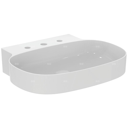 Umywalka Linda-X wisząca, nieszlifowana od spodu, do samodzielnego montażu. Z 3 wybitymi otworami na baterię, bez przelewu. Niezbędny montaż z ukryty system przelewowy IdealFlow N8326AA lub syfon typu free flow E2114xx - w osobnym zamówieniu.