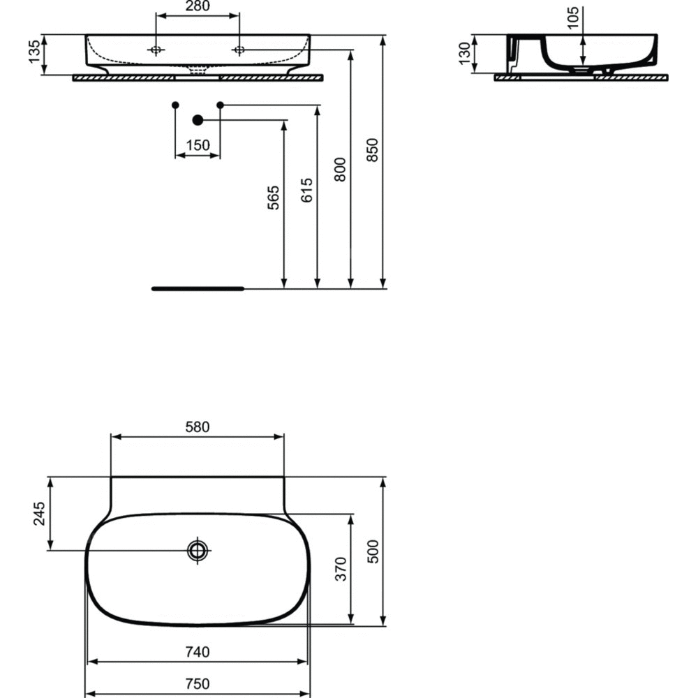 Umywalka Linda-X do montażu na meblach lub blacie (szlifowany spód). Bez otworu na baterię oraz bez przelewu. W komplecie szablon do wycinania TT0299731.