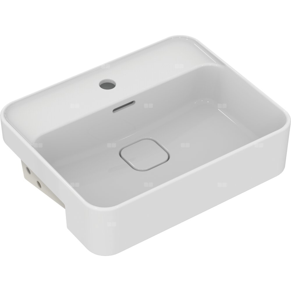 Umywalka półblatowa Strada II z 1 otworem na baterię, ze szczelinowym przelewem i korkiem o białej pokrywie. Zestaw montażowy i szablon do wycinania w zestawie. Opcjonalny montaż z korkiem typu Click-clack z metalową pokrywą T3629AA.