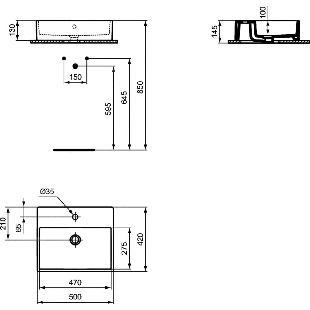 Otwór na baterię. Możliwość skompletowania z odpowiednimi meblami lub syfonem chromowanym. W komplecie szablon do wycinania w blacie. Zalecane dodatkowe elementy: Syfon dekoracyjny do umywalki G1 1/4 E0079AA. Przyłącze kątowe dekoracyjne A3491AA. Syfon G1 1/4 A2305AA. Przyłącze kątowe B7883AA. Rozeta do syfonu G1 1/4 B4801AA. Korek G1 1/4 do umywalek bez przelewu J3291AA.