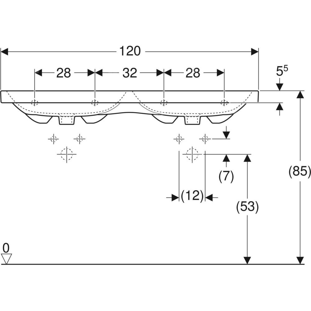 Umywalka GEBERIT iCon Light podwójna 2-stanowiskowa prostokątna, biała, 1200mm, otwór na baterię na środku, z odpływem przelewowym, półka od ściany