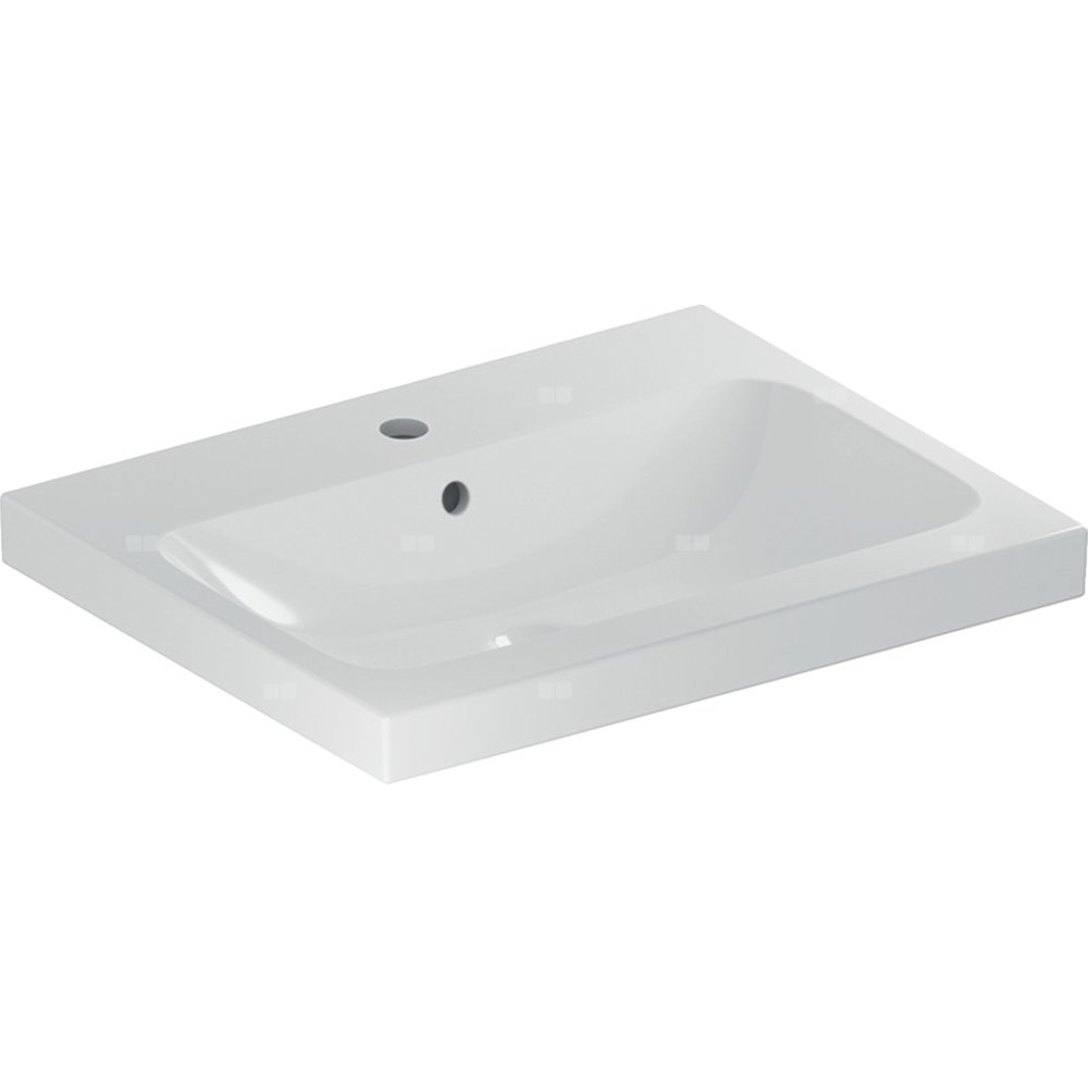 Umywalka GEBERIT iCon Light prostokątna, biała, 600mm, otwór na baterię na środku, stawiana na blat, z odpływem przelewowym, półka od ściany