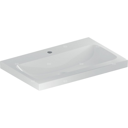 Umywalka GEBERIT iCon Light prostokątna, biała, 750mm, otwór na baterię na środku, stawiana na blat, bez odpływu przelewowego, półka od ściany