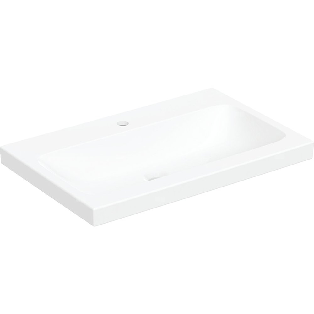 Umywalka GEBERIT iCon Light prostokątna, biała / KeraTect, 750mm, otwór na baterię na środku, stawiana na blat, bez odpływu przelewowego, półka od ściany