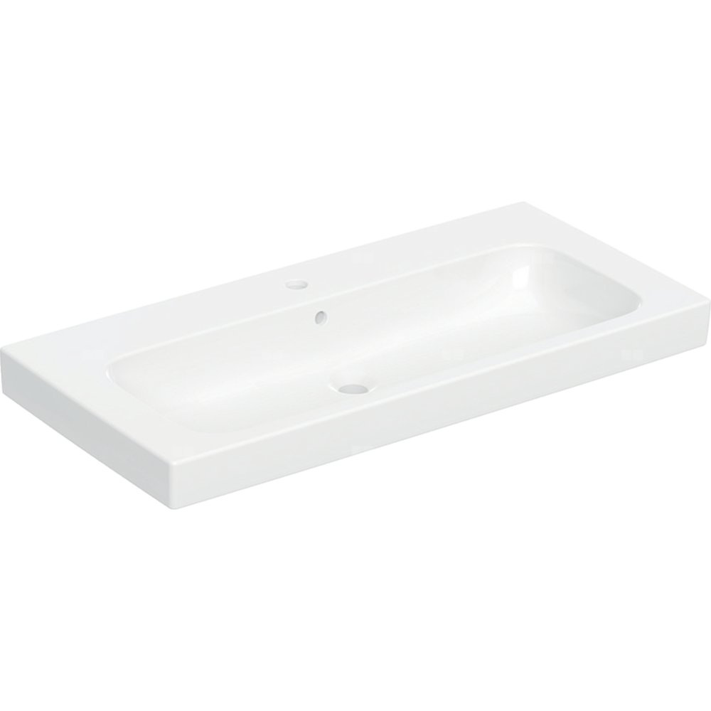 Umywalka GEBERIT Modo prostokątna, biała, 100mm, otwór na baterię na środku, z odpływem przelewowym, półka od ściany