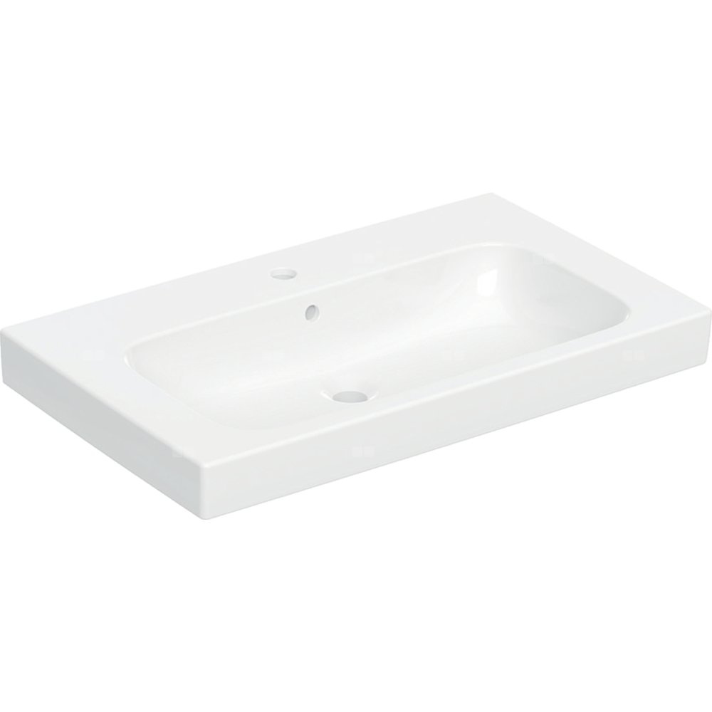 Umywalka GEBERIT Modo prostokątna, biała, 800mm, otwór na baterię na środku, z odpływem przelewowym, półka od ściany