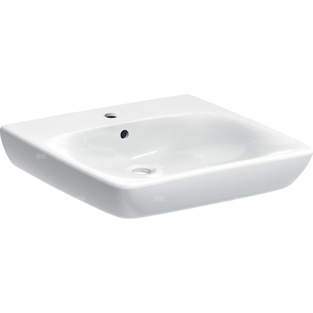Umywalka GEBERIT Selnova Comfort prostokątna, biała, 600mm, otwór na baterię na środku, z odpływem przelewowym, półka od ściany