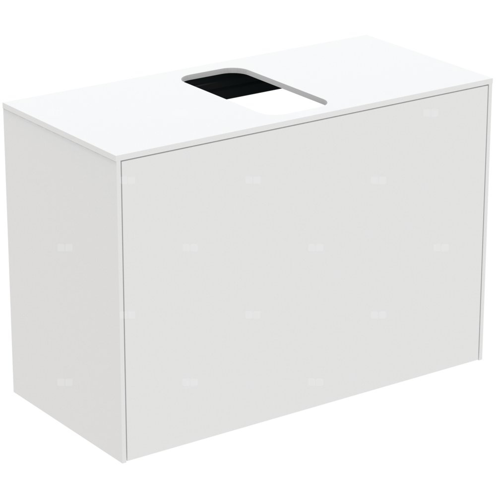 Szafka pod umywalkę z centralnie wyciętym otworem w blacie. Z 1 zewnętrzną i 1 wewnętrzną szufladą z funkcjami push to open i samodomykania "soft close". Wykończenie wewnętrzne szafek w kolorze antracytowym. Do kompletowania z umywalkami wiszącymi lub nablatowymi.