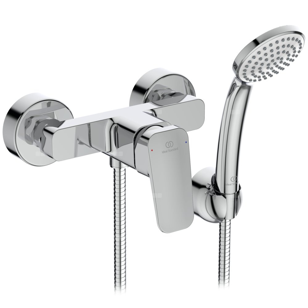 Innowacyjna ceramiczna głowica FirmaFlow®, 38 mm, z funkcją. ograniczenia temperatury wody. Metalowy uchwyt z oznaczeniem wody: ciepła/zimna. Zawór zwrotny. Przyłącza mimośrodowe. Metalowe rozety maskujące. Jednofunkcyjna słuchawka prysznicowa. Uchwyt ścienny do słuchawki prysznicowej. Metalowy wąż natryskowy, 1500 mm.