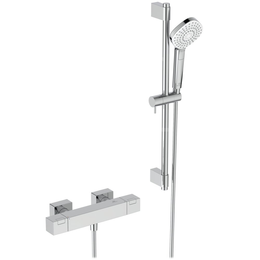 Zestaw natryskowy z baterią termostatyczną Ceratherm C100, drążkiem 600 mm oraz 3 - fukncyjną słuchawką natryskową Evo Diamond. Zawór zwrotny. Głowica termostatyczna ECO z przyciskiem redukującym przepływ wody o 50%. Funkcja Cool body zapobiegająca poparzeniu przez korpus baterii. Ukryte przyłącza mimośrodowe (regulowane 137 mm - 163 mm). Funkcja Alti-Kalk. W zestawie z wężem natryskowym IdealFlex 1750mm i ukrytym przyłączem G1/2".