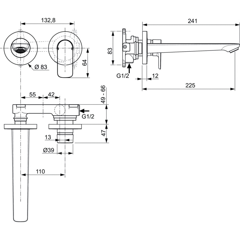 Zestaw montażowy podtynkowej baterii umywalkowa z wylewką 225 mm. Głowica ceramiczna 28 mm. Metalowy automatyczny korek. Aerator typu Perlator M24x1. Metalowy uchwyt z nadrukowanymi czerwonymi i niebieskimi oznaczeniami. Osobne okrągłe rozety dla uchwytu i wylewki. Do skompletowania z zestawem A5948NU (część wewnętrzna).