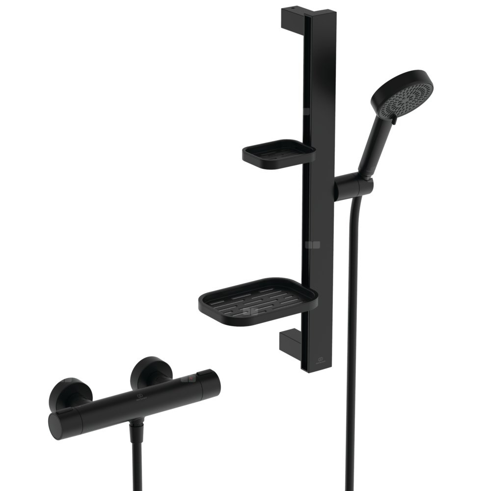 Dzięki zestawowi prysznicowemu Ideal Standard z serii Ceratherm Alu+ można doświadczać kojących chwil pod prysznicem, zapewniających prawdziwy relaks, i korzystać z technologii przyjaznej dla środowiska. Wykonany w 84% z aluminium pochodzącego z recyklingu i w 100% nadający się do recyklingu zestaw jest ekologicznym produktem do łazienki. Słuchawka prysznicowa posiada dwie funkcje do wyboru: relaksujący delikatny deszcz z ultradrobnymi kroplami wody lub orzeźwiający masaż strumieniem masującym. Obie głowice prysznicowe są łatwe do czyszczenia dzięki funkcji EasyClean – osady z kamienia na silikonowych dyszach można usunąć poprzez delikatne przetarcie. Na dwóch półkach znajduje się dużo miejsca na osobiste przybory prysznicowe. Można je zamontować albo po lewej, albo po prawej stronie drążka prysznicowego.
