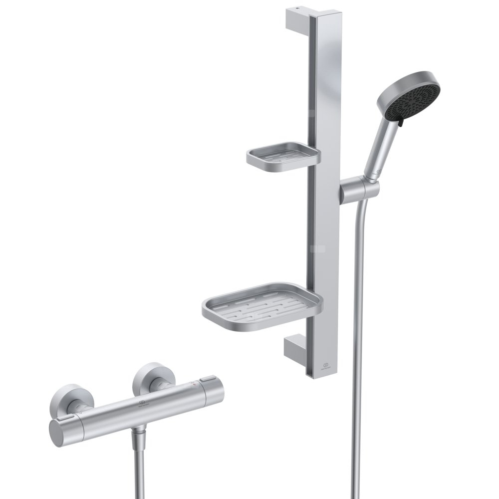 Dzięki zestawowi prysznicowemu Ideal Standard z serii Ceratherm Alu+ można doświadczać kojących chwil pod prysznicem, zapewniających prawdziwy relaks, i korzystać z technologii przyjaznej dla środowiska. Wykonany w 84% z aluminium pochodzącego z recyklingu i w 100% nadający się do recyklingu zestaw jest ekologicznym produktem do łazienki. Słuchawka prysznicowa posiada dwie funkcje do wyboru: relaksujący delikatny deszcz z ultradrobnymi kroplami wody lub orzeźwiający masaż strumieniem masującym. Obie głowice prysznicowe są łatwe do czyszczenia dzięki funkcji EasyClean – osady z kamienia na silikonowych dyszach można usunąć poprzez delikatne przetarcie. Na dwóch półkach znajduje się dużo miejsca na osobiste przybory prysznicowe. Można je zamontować albo po lewej, albo po prawej stronie drążka prysznicowego.