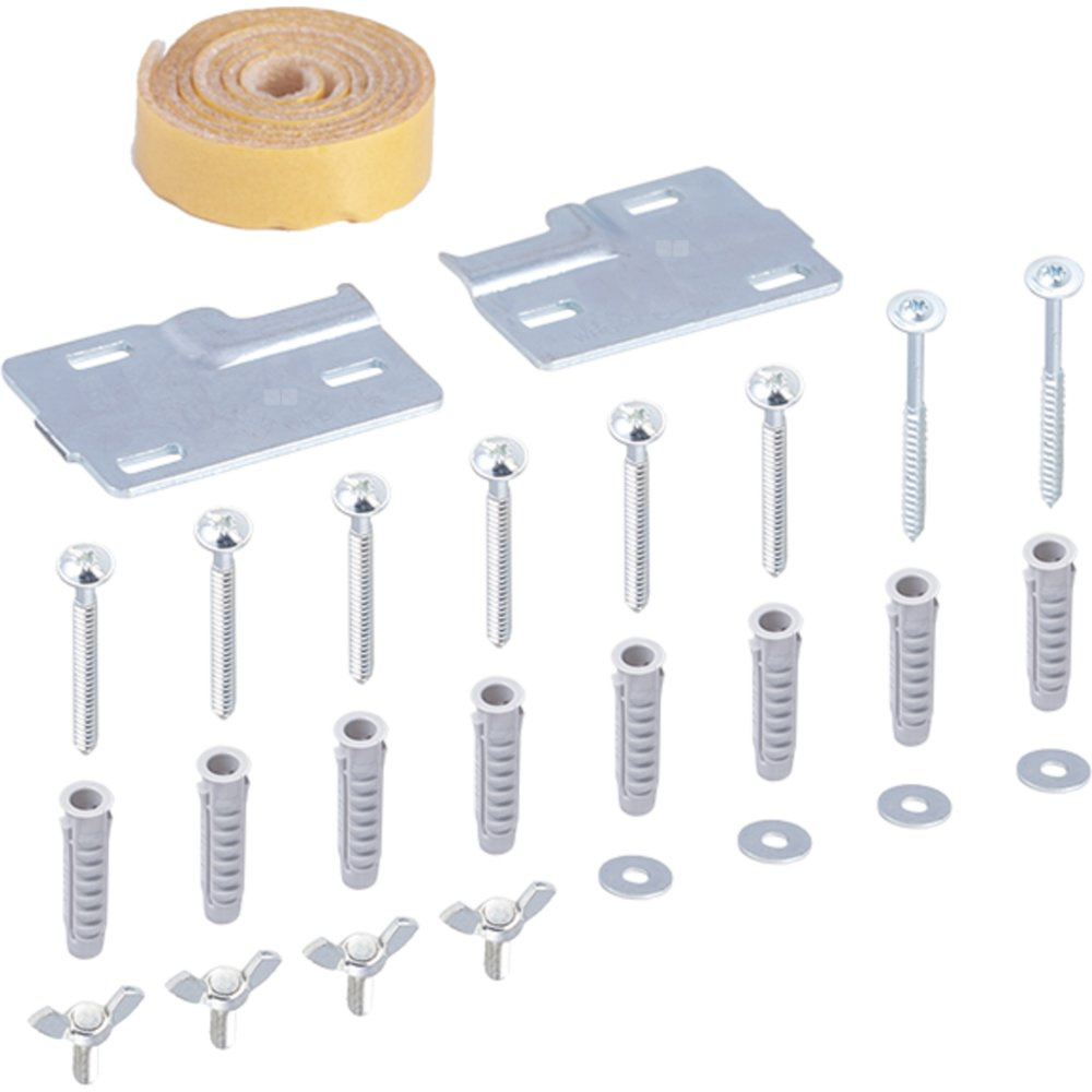 2 płyty montażowe 6 śrub do płyt montażowych 8 kołków rozporowych 2 śruby do szyn montażowych 3 nakrętki motylkowe 3 podkładki Taśma klejąca