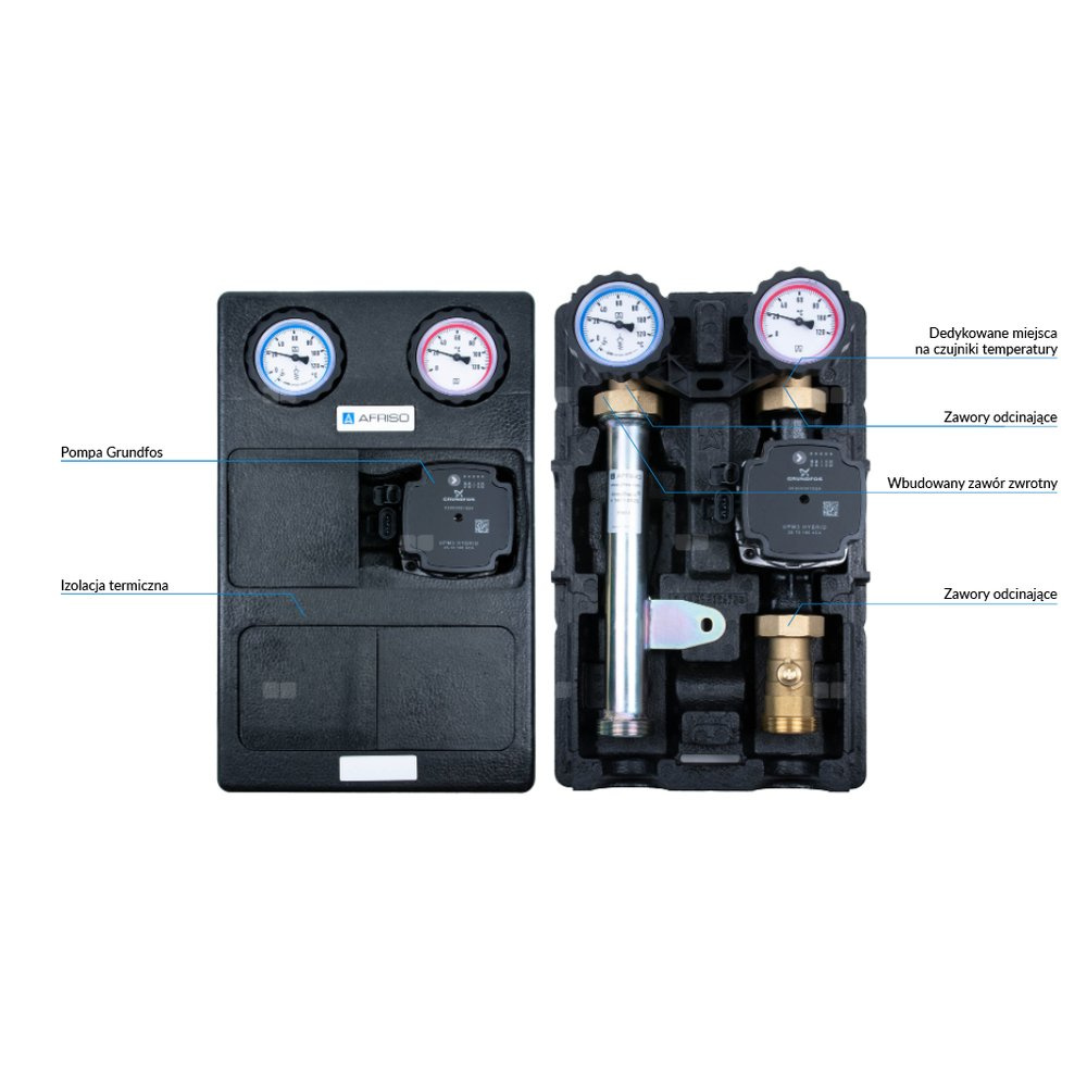 Wyposażona w niezbędne komponenty: termometry, zawór zwrotny, zawory odcinające na zasilaniu i powrocie, zawór odcinający przed pompą i izolację termiczną.