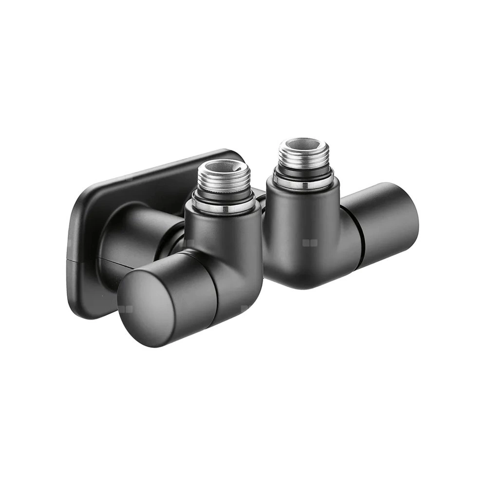 HIGH-STYLE para zaworów dekoracyjnych 3-osiowych Zestaw zawiera: - 3-osiowy zawór termostatyczny z pokrętłem przystosowany do montażu głowicy termostatycznej z serii 205; - 3-osiowy zawór odcinający; - dwie maskownice do montażu na ścianie, przyłącza: rozstaw otworów 50 mm. Przyłącze centralne. Do użycia ze złączkami z serii 437, 447, 681 i 679. podłącznie rury: G 1/2" A (ISO 228-1) GZ, wlot, prawy, Podłączenie do złączek Caleffi. podłączenie grzejnika: 23 p. 1,5, wylot, prawy. Maksymalne ciśnienie pracy: 10 bar. Zakres temperatury medium: 5–100 °C. Wykończenie: czarny (czarna, czarne). Kv zawór: 1,27 m³/h. Materiał: mosiądz.