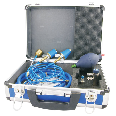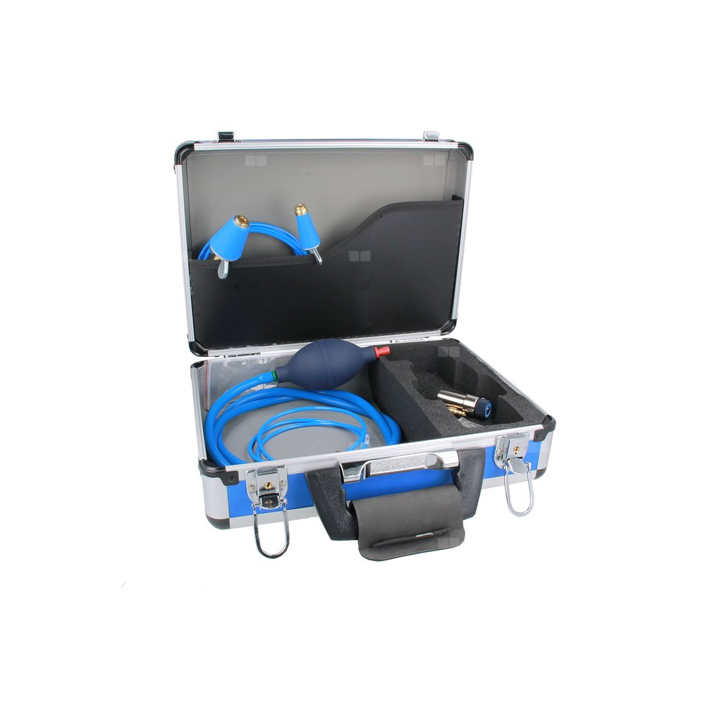 - Wyposażony w aluminiową walizkę, zawór odcinający, pompkę, różnego typu przyłącza do instalacji.
