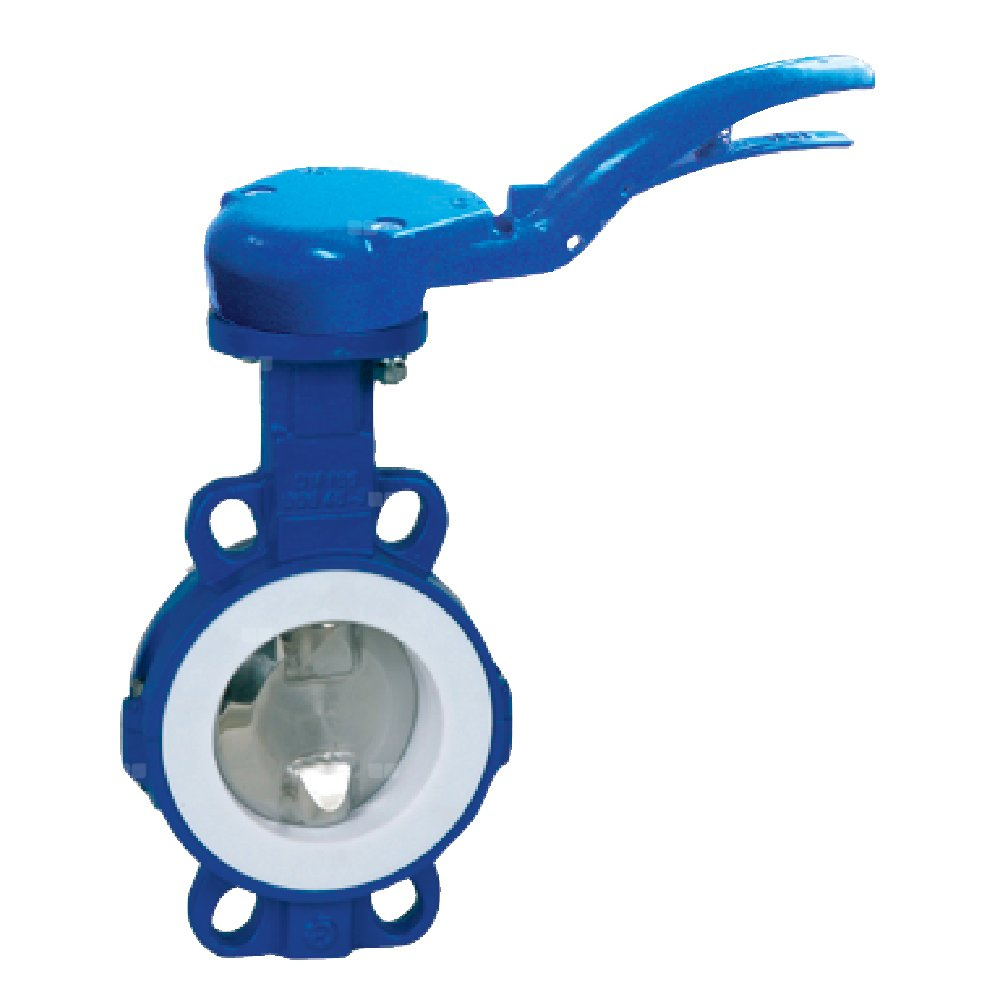Przepustnica bezkołnierzowa LYCENE z napędem ręcznym dźwigniowym, dysk: Duplex, wykładzina: PTFE, korpus: GGG40 epoksyd., Pnom 1,0 MPa, tmax=200 st.C DN 65