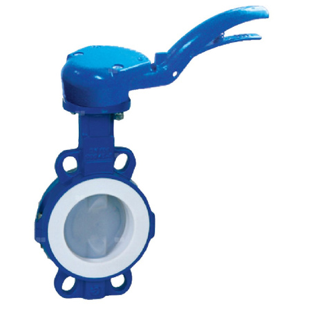 Przepustnica bezkołnierzowa LYCENE z napędem ręcznym dźwigniowym, dysk: powlekany PFA, wykładzina: PTFE, korpus: GGG40 epoksyd., Pnom 1,0 MPa, tmax=200 st.C DN100