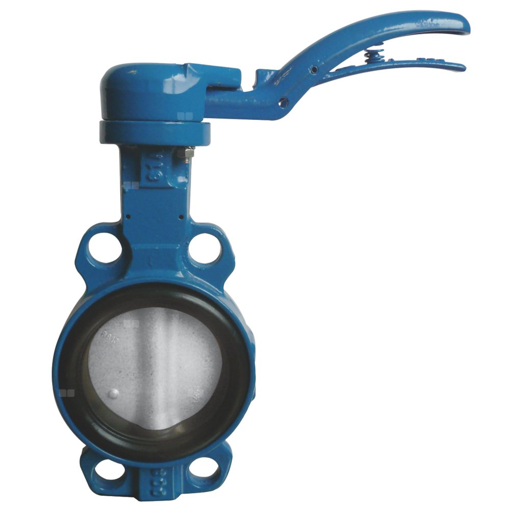 Przepustnica bezkołnierzowa SYLAX z napędem ręcznym dźwigniowym, dysk: AISI316., wykładzina: EPDM, korpus: GGG40 epoksyd., Pnom 2,0 MPa, tmax=90 st.C DN100