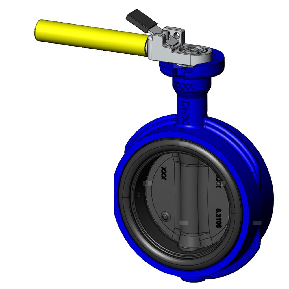 Przepustnica pierścieniowa SYLAX GAS z dźwignią ręczną, dysk: GGG40 powl. poliamidem, wykładzina: NBR, korpus: GGG40 epoksyd., Pnom 0,6 MPa, tmax=60 st.C DN80