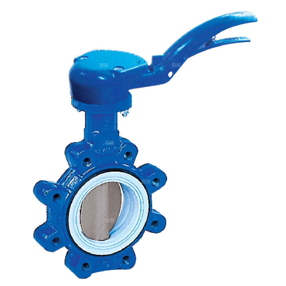 Przepustnica z otworami gwintowanymi TILIS z napędem ręcznym dźwigniowym, dysk: AISI316, wykładzina: PTFE, korpus: GGG40 epoksyd., Pnom 1,0 MPa, tmax=150 st.C DN200