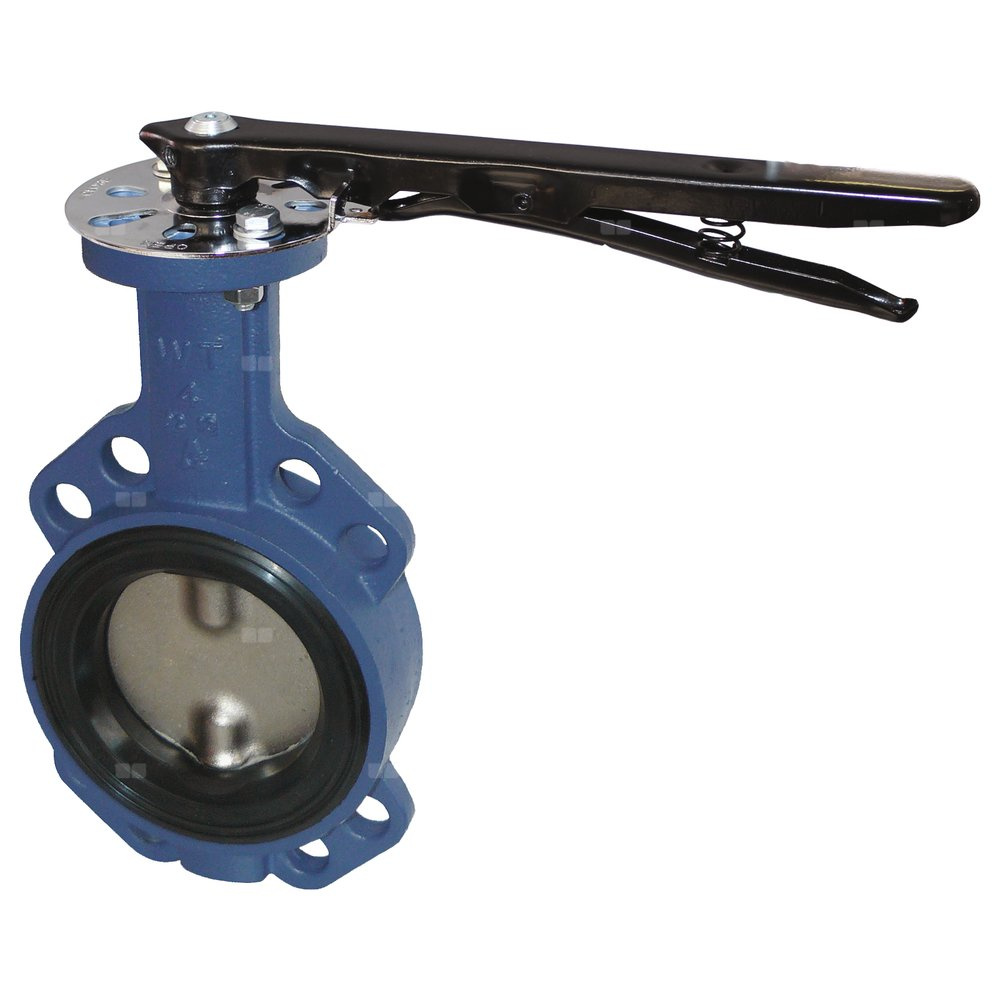 Zawór klapowy regulacyjny i odcinający. Korpus z żeliwa szarego JL1040 wg EN1561, polakierowany na niebiesko, dźwignia napędu z poliamidu wzmocnionego włóknem szklanym, z blokadą wspomaganą sprężynowo i zintegrowanym otworem do ryglowania.
