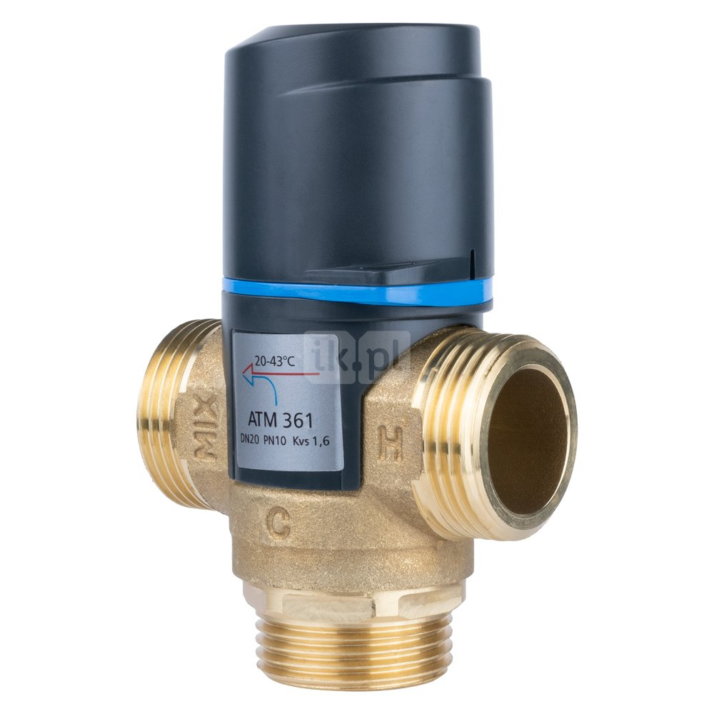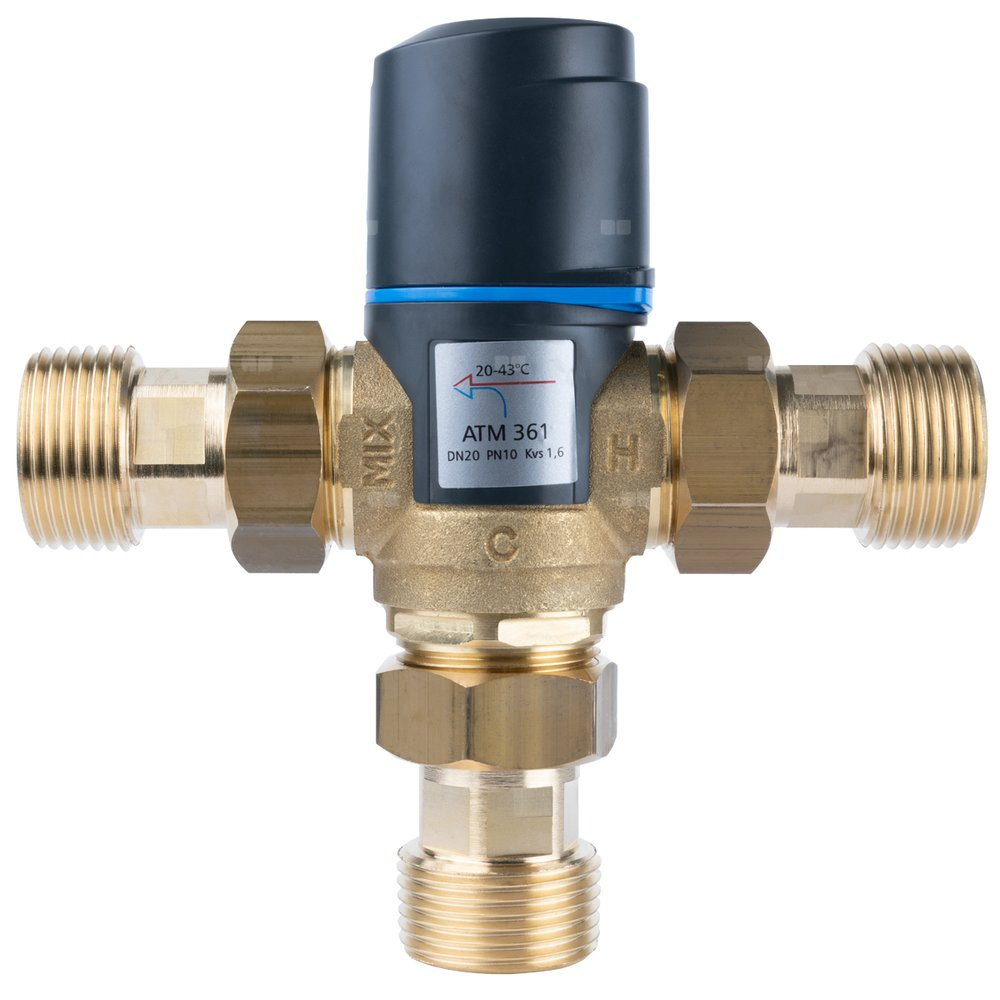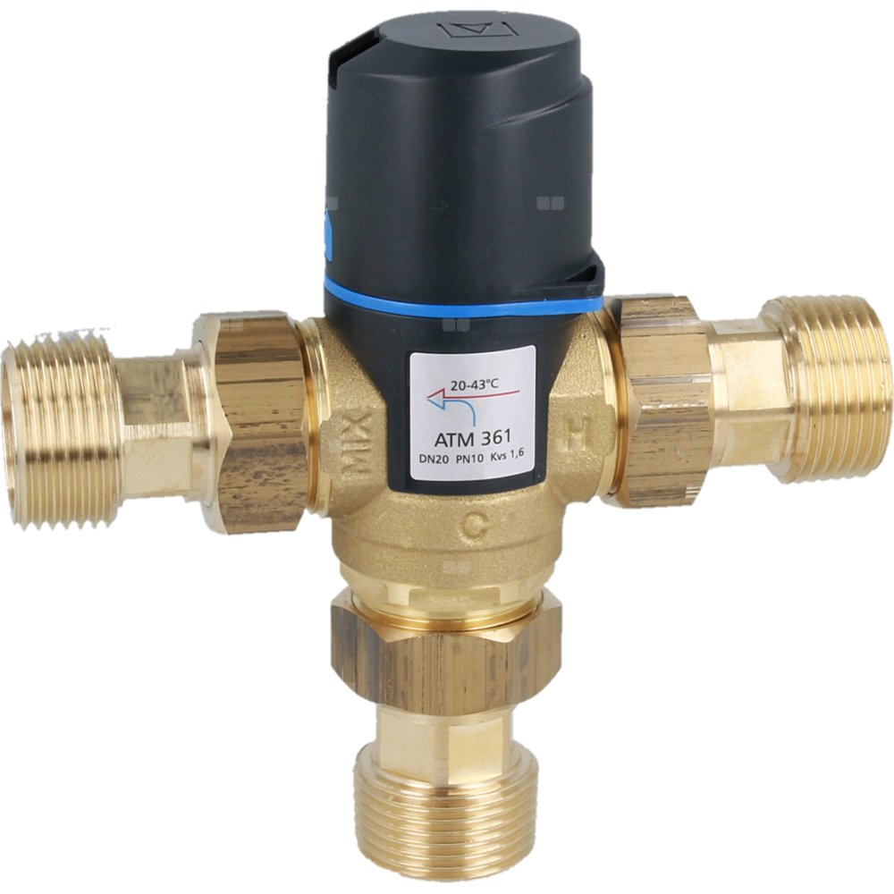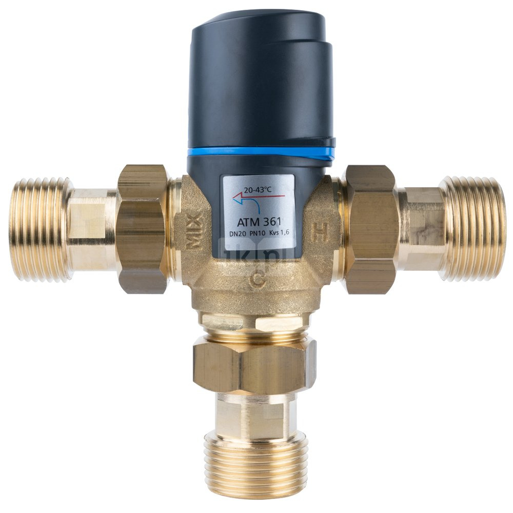 Zawór regulacyjny termostatyczny do wody ciepłej AFRISO ATM 361 ze śrubunkami mosiądz GZ 1'', DN 20, zakres temp. 20-43'C, Kvs 1.6 m3/h, maksymalna temperatura 90'C, maksymane ciśnienie 10 bar