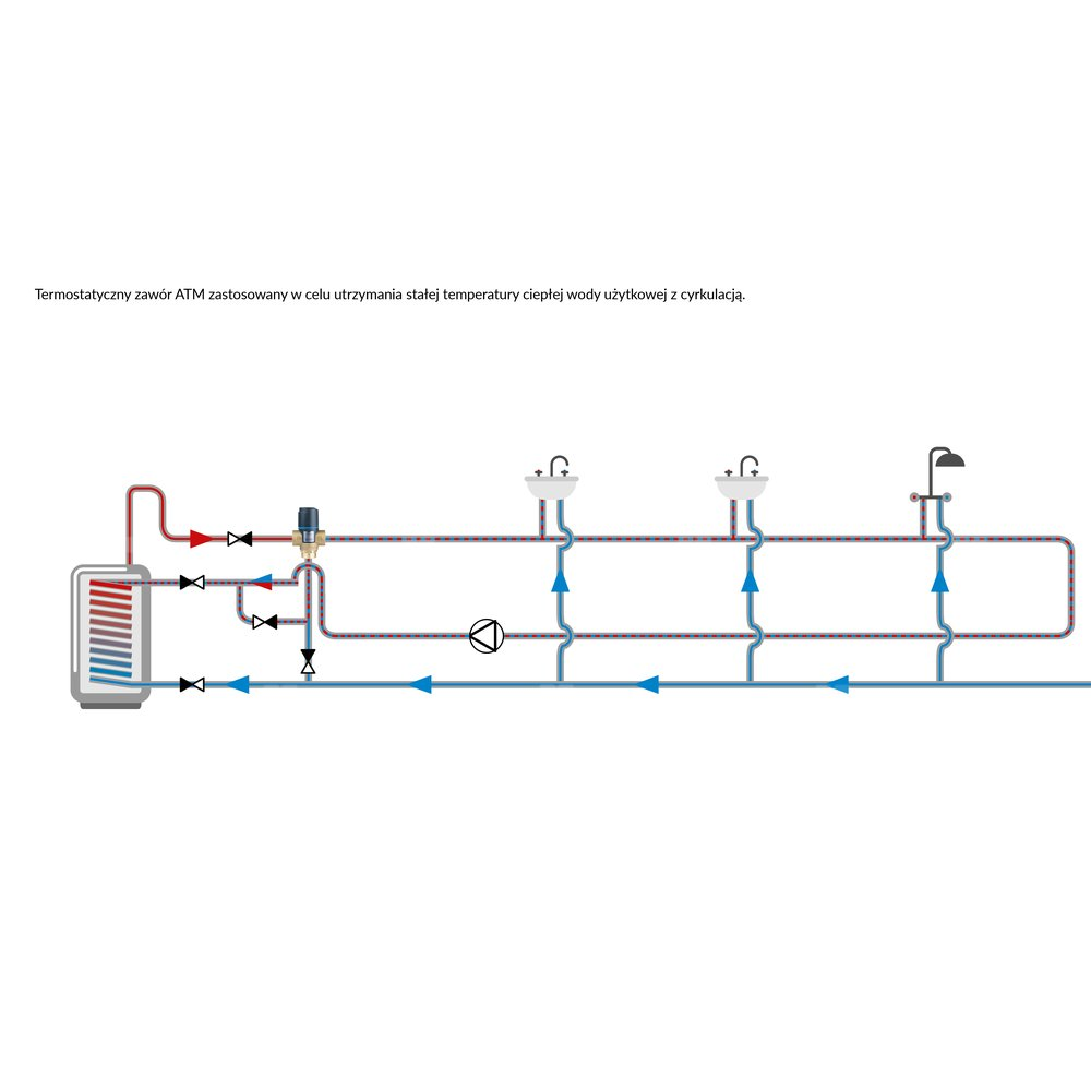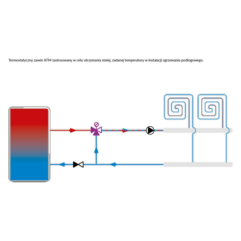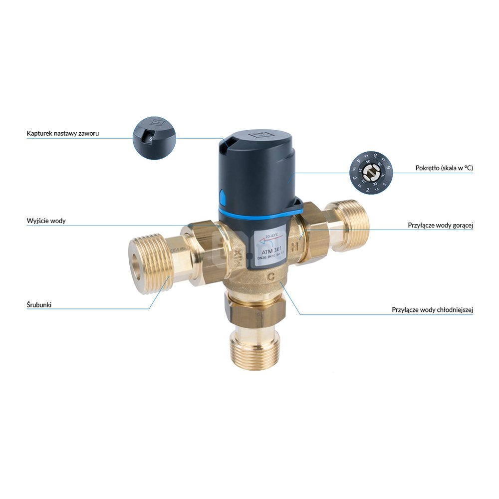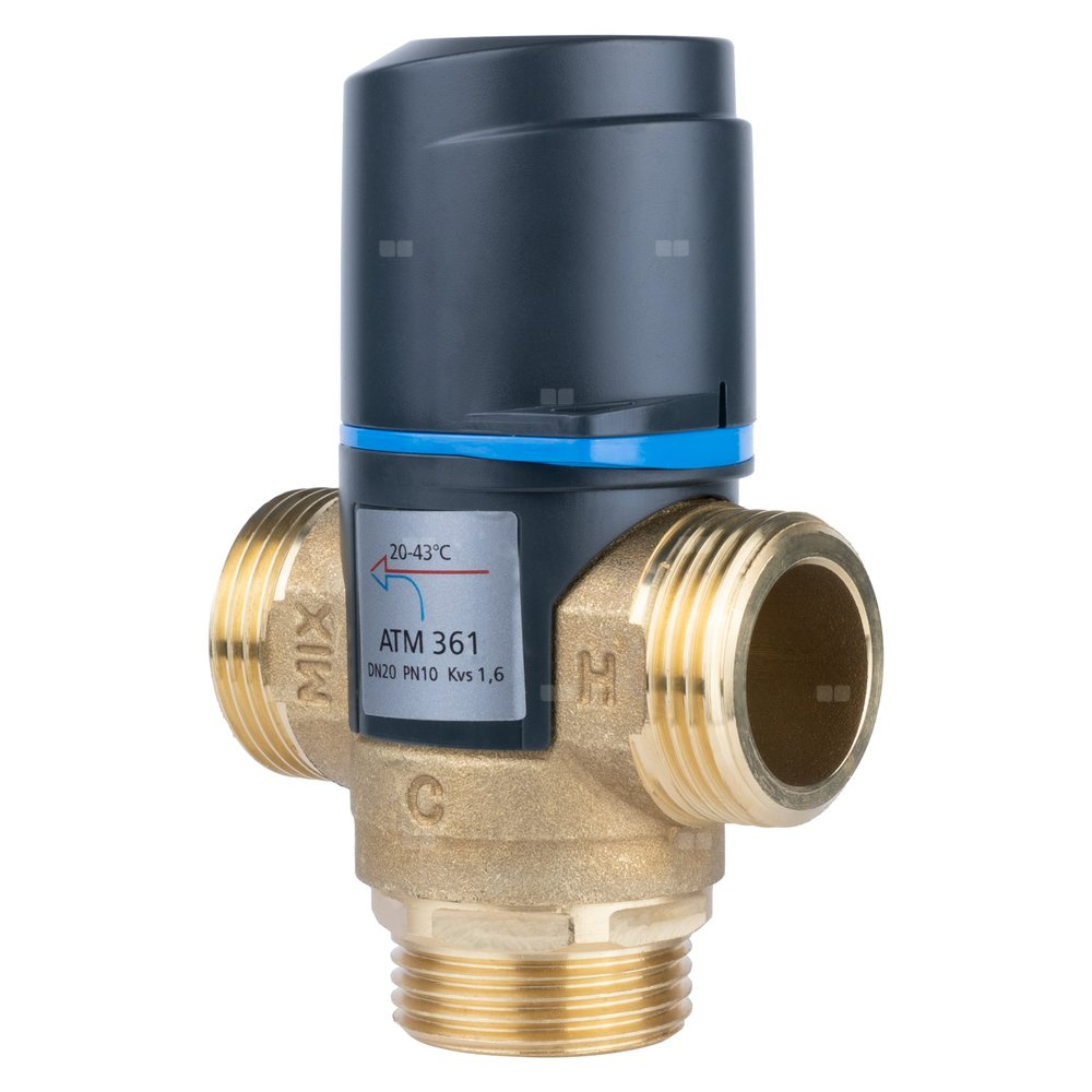 Zawór regulacyjny termostatyczny do wody ciepłej AFRISO ATM 361 ze śrubunkami mosiądz GZ 1'', DN 20, zakres temp. 20-43'C, Kvs 1.6 m3/h, maksymalna temperatura 90'C, maksymane ciśnienie 10 bar