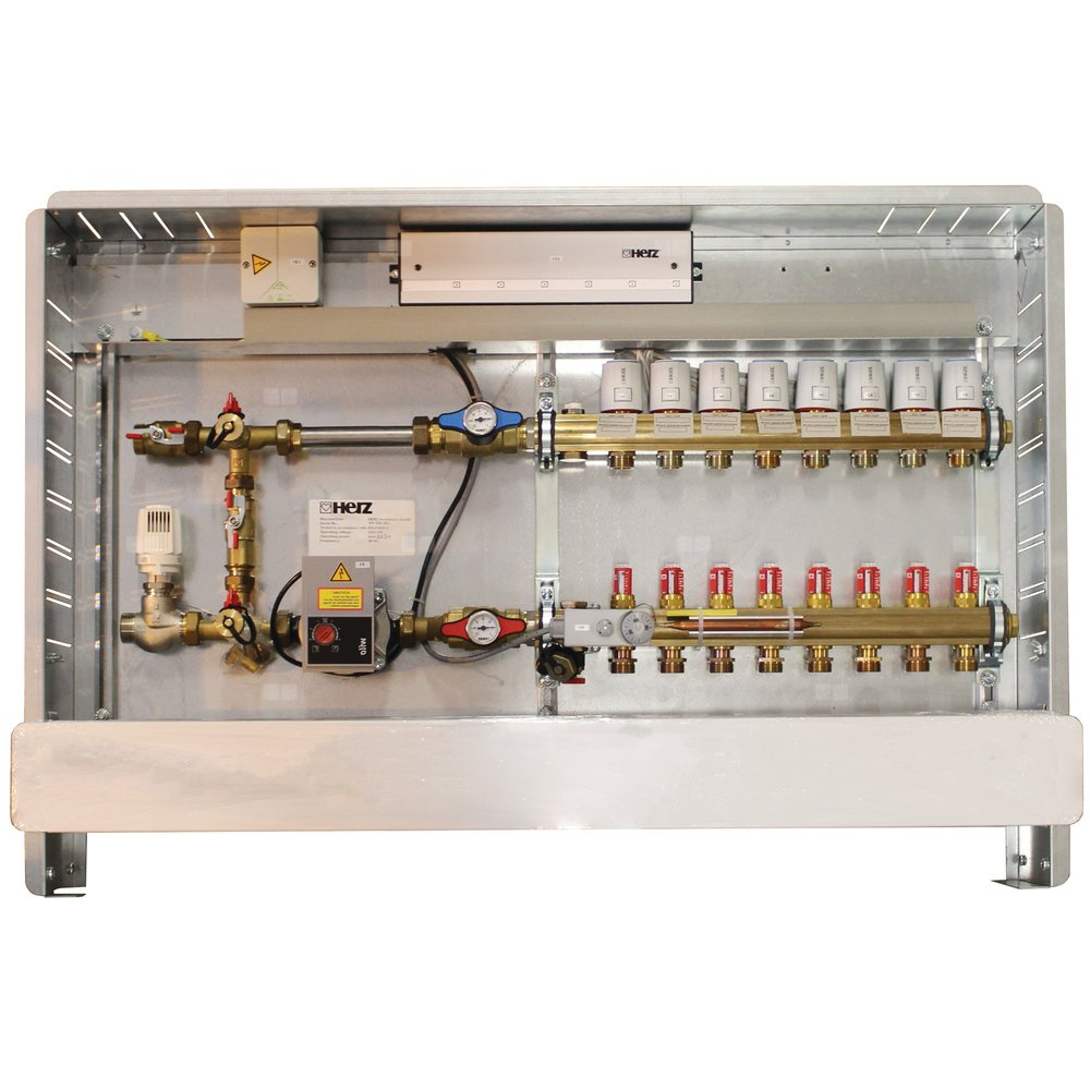 Kompletna stacja regulacyjna 230 V, 50 Hz, do ogrzewania podłogowego, przyłącze z prawej strony. Części składowe:- para rozdzielaczy mosiężnych, rozdzielacz zasilający z wkładkami regulacyjnymi z przepływomierzami, rozdzielacz powrotny z wkładkami termostatycznymi, odpowietrzenie, spust wody z przyłączem do węża, kołpaki końcowe - uchwyty - siłowniki termiczne do regulacji obwodów grzewczych - mechaniczna regulacja temperatury- zawór odcinający - elektroniczna pompa obiegowa - rozdzielacz elektryczny, z okablowaniem do siłowników termicznych - automatyczne zabezpieczenie przed przegrzaniem układu poprzez wyłączenie pompy Zestaw zamontowany w szafce z blachy stalowej ocynkowanej, rama oraz front drzwi pomalowane na biało metodą proszkową (RAL 9003). Regulowana głębokość (150-190 mm) oraz wysokość (720-805) mm, zdejmowana szyna do prowadzenia rur