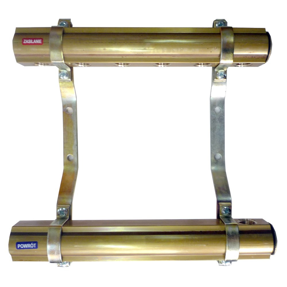 Rozdzielacze centralnego ogrzewania przeznaczone do rozdzielenia medium grzewczego na poszczególne grzejniki. Belki mosiężne profilowe z GW1" przyłącza 1/2" (sekcje). Wyposażenie: korek 1" - 2 szt., wieszak - 2szt.
