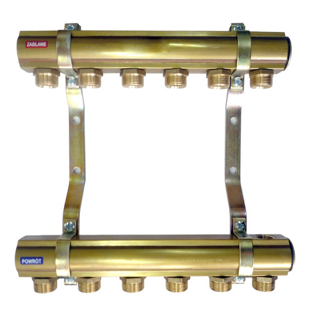 Rozdzielacz centralnego ogrzewania przeznaczony do rozdzielenia medium grzewczego na poszczególne grzejniki. Belki mosiężne profilowe z GW1". Wyposażenie: korek 1" - 2 szt., wieszak - 2 szt. oraz nyple 1/2"x3/4".