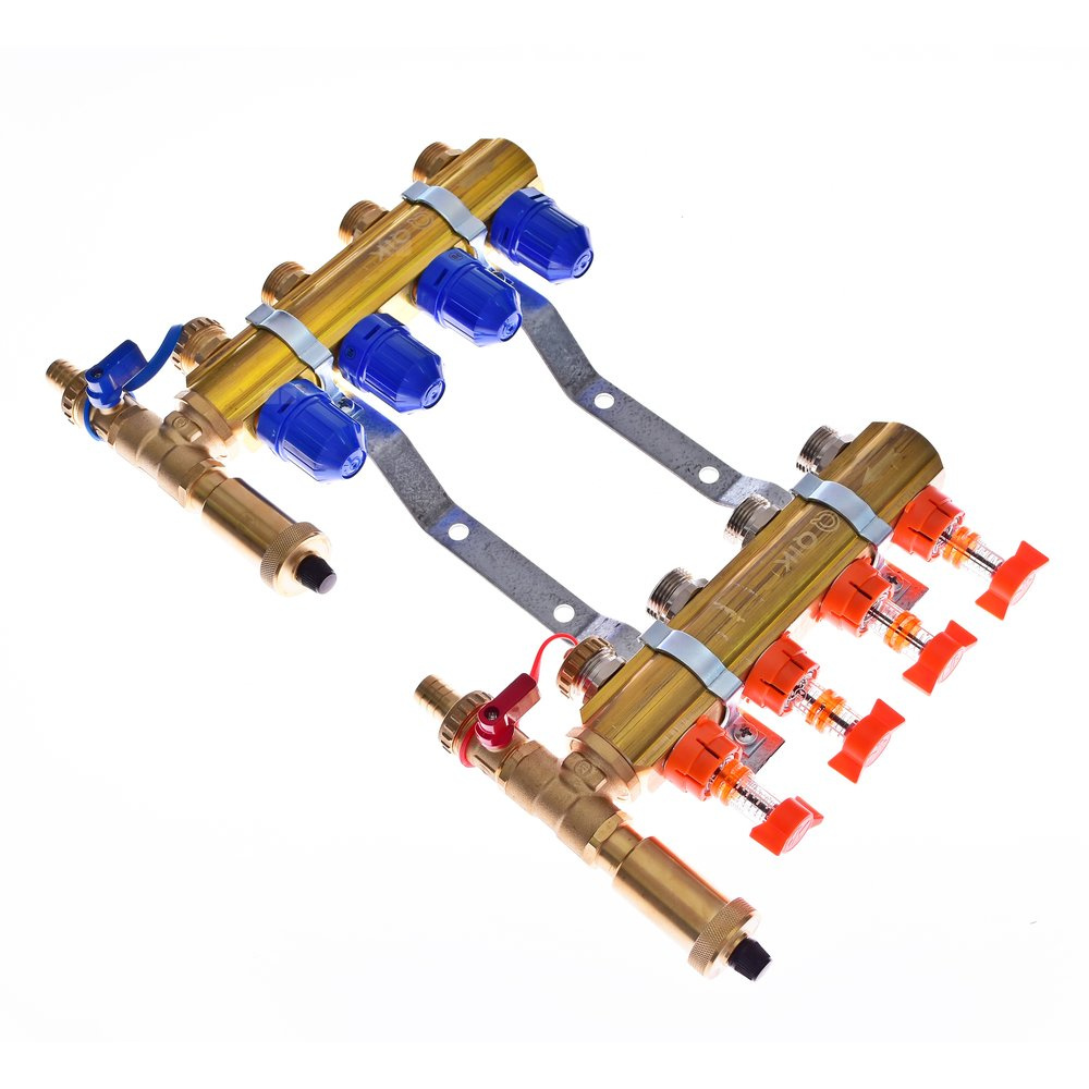 Rozdzielacze ogrzewania podłogowego, przeznaczone do rozdzielenia medium grzew­czego na poszczególne pętle. Belki mosiężne profilowe 1" o wysokości profilu 39mm, w skład kompletu wchodzi: • rotametry na belce zasilającej o zakresie przepływu 0-5 l • termostatyczne zawory regulacyjne ręczne z pokrętłem, pod siłowniki M30x1,5 • uchwyty montażowe z płaskownika o grubości 3mm z amortyzatorami - 2 szt. • nyple GZ 3/4" z o-ringiem o rozstawie 50mm • korki 1" pod klucz z o-ringiem - 2 szt. • zawory spustowe - 2 szt. • odpowietrzniki automatyczne - 2 szt.