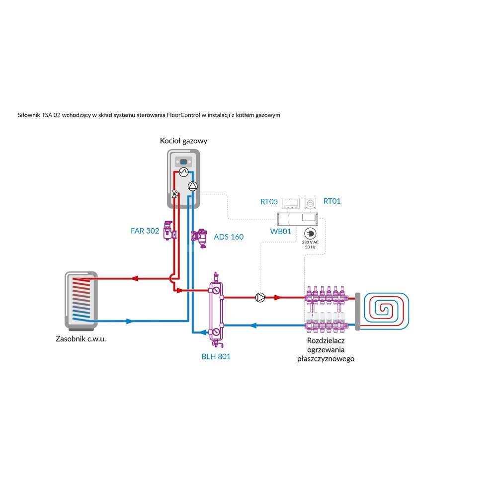 Siłownik termoelektryczny TSA-02Siłownik służy do sterowania zaworami termostatycznymi w rozdzielaczach.- zasilanie 230 V- przyłącze g.w. M 28 x 1.5- normalnie zamknięty- skok 3,2 mm