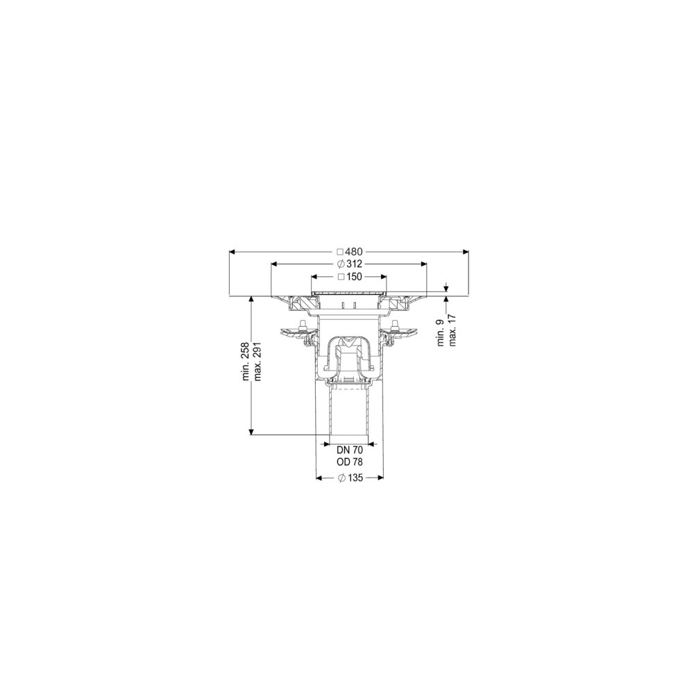 KESSEL Wpust obiek. Ecoguss doc.koł.usz., wielkość nominalna (DN) 70, dł. pokrywy 138 mm, króciec pionowy, syfonem w zestawie, odwodnienie przez odpływ punktowy, maks. wys. posadzki 17 mm, typ pokrywy Kratka szczelinowa, regulowany w trzech wymiarach