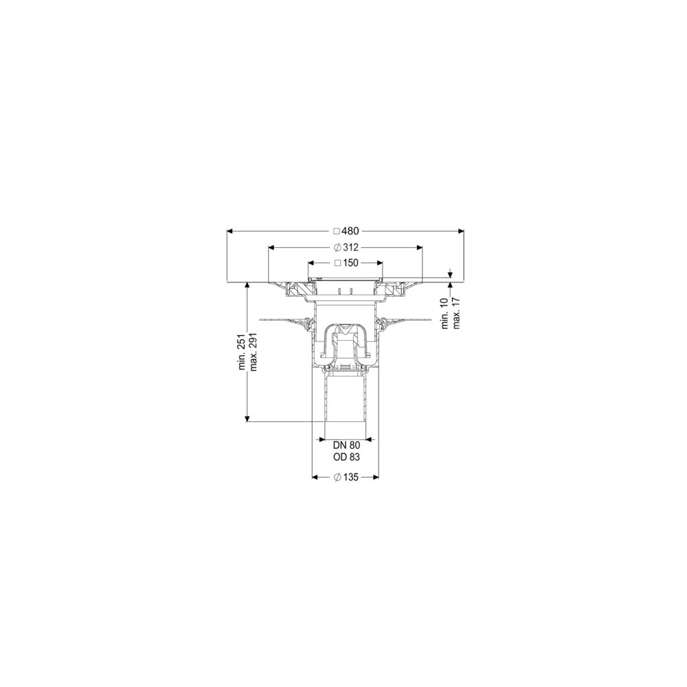 KESSEL Wpust obiektowy Ecoguss kołnier., wielkość nominalna (DN) 80, króciec pionowy, odwodnienie przez odpływ punktowy, syfonem w zestawie, maks. wys. posadzki 17 mm, typ pokrywy Kratka szczelinowa, regulowany w trzech wymiarach