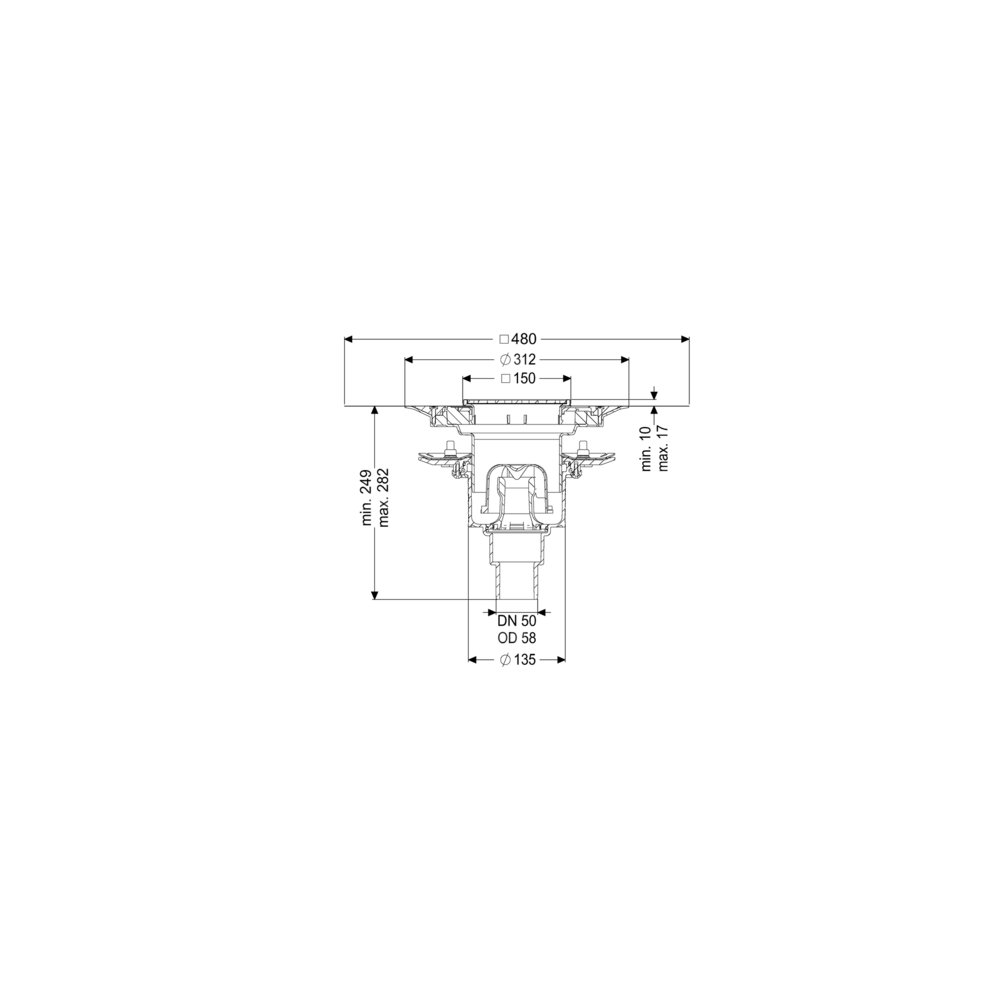 KESSEL Wpust obiek. Ecoguss doc.koł.usz., wielkość nominalna (DN) 50, dł. pokrywy 138 mm, króciec pionowy, syfonem w zestawie, odwodnienie przez odpływ punktowy, maks. wys. posadzki 17 mm, typ pokrywy Kratka szczelinowa, regulowany w trzech wymiarach