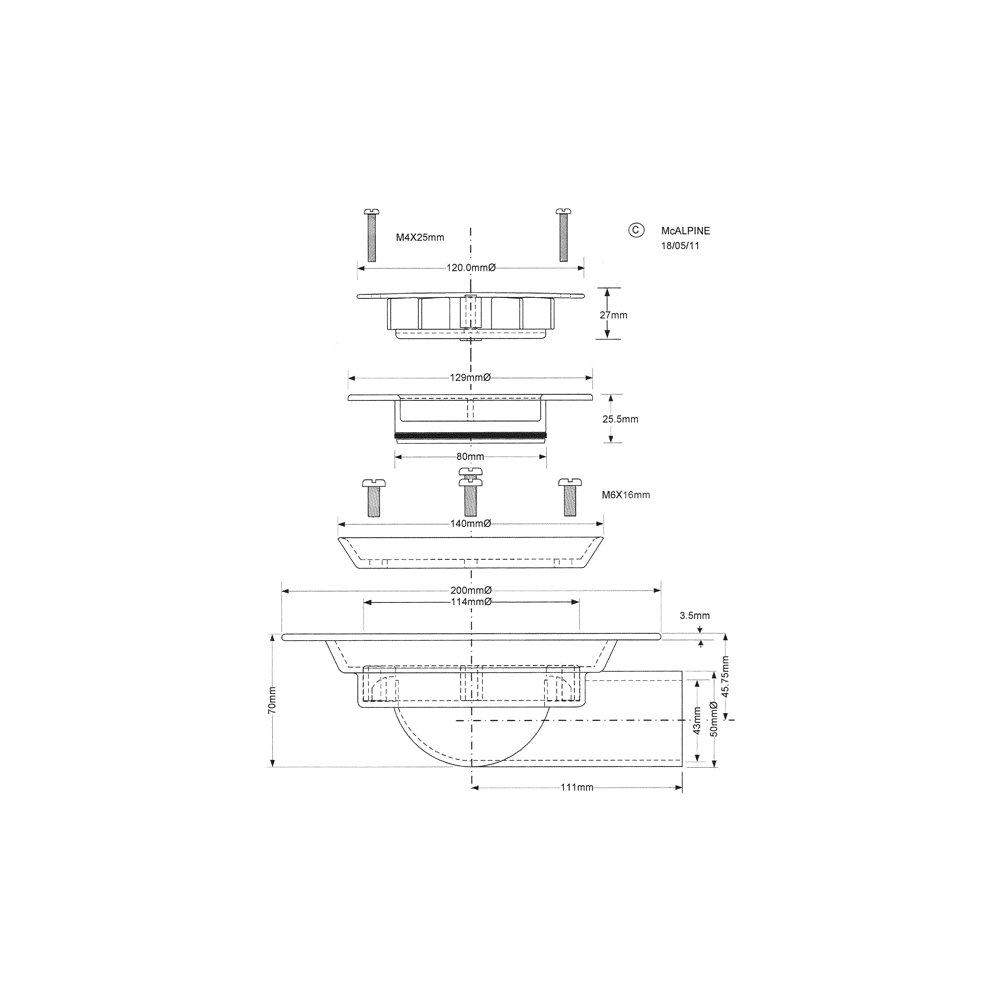 Wpust podłogowy wykonany z ABS z odpływem 50mm, czyszczony od góry z kratką ze stali nierdzewnej120mm