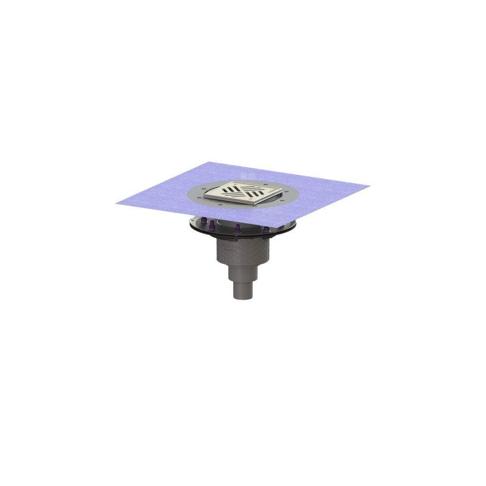 Wpust podłogowy/stropowy Practicus z tworzywa sztucznego służy do odwodnienia punktowego i jest wyposażony w dociskowy kołnierz uszczelniający oraz wyjmowany syfon, uszczelkę wargową i pokrywę ochronną na czas fazy budowlanej. Z nasadą z ABS z teleskopową regulacją wysokości. Wpust spełnia szczególne wymagania w zakresie izolacyjności akustycznej zgodnie z pomiarami Instytutu Frauenhofera w Stuttgarcie. Dociskowy kołnierz uszczelniający z bolcami i śrubami ze stali nierdzewnej służy do dociskania lub zgrzewania taśm bitumicznych i polimerowo-bitumicznych oraz taśm uszczelniających z tworzywa sztucznego i elastomerów. Do uszczelnień wodoszczelnych mogą być stosowane tylko sprawdzone przez producenta membrany hydroizolacyjne.
