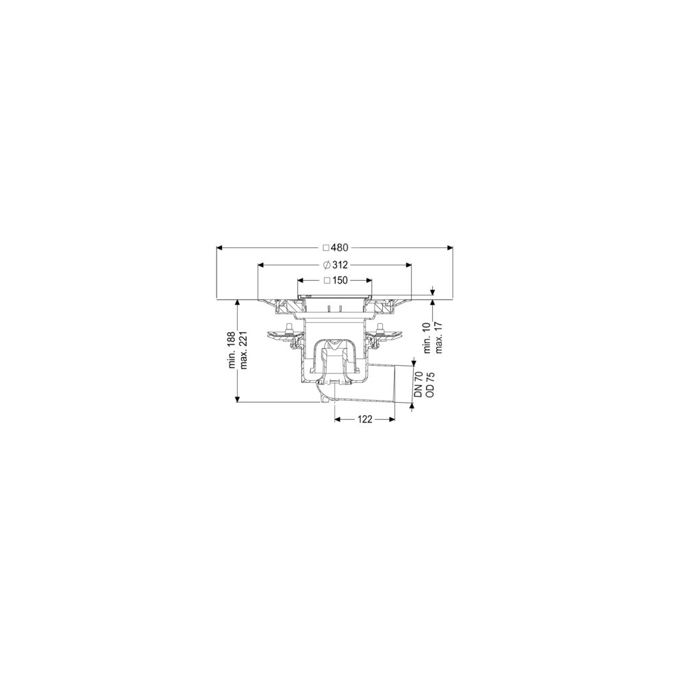 KESSEL Wpust obiek. Practicus doc.koł., dł. pokrywy 138 mm, króciec boczny, wielkość nominalna (DN) 70, syfonem w zestawie, typ pokrywy Kratka szczelinowa, kratka design Kessel, uszczelnienie nasadzie przez załączona mata uszczelniająca do przyklejenia (zmu) wg DIN 18534