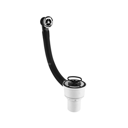 Spust umywalkowy 1.1/4″x70 mm z przelewem zakończonym odpływem chromowanym dekoracyjnym, z sitkiem ze stali nierdzewnej  i korkiem gumowym.