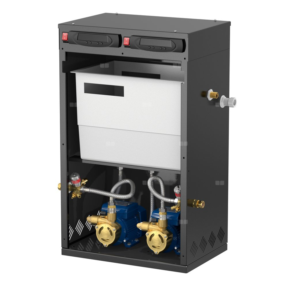 Flexfiller Twin System to jednostka przypodłogowa, idealna tam, gdzie ograniczenia przestrzenne sprawiają, że korzystne jest umieszczenie dwóch systemów w jednej obudowie. System łączy w sobie dwa urządzenia do uzupełniania ciśnienia o wysokim natężeniu przepływu (<18 l/min) i dwa sterowniki z jednym 18-litrowym zbiornikiem wyrównawczym.