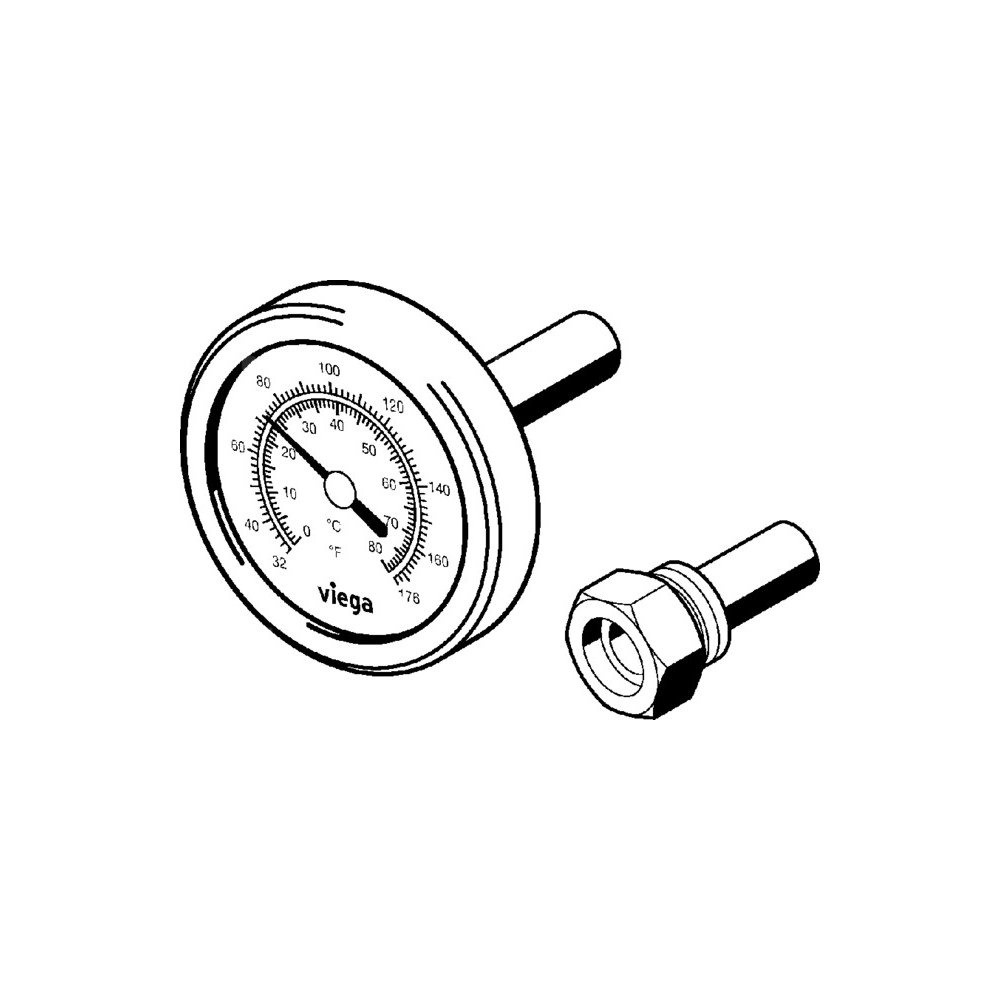 Zestaw termometrów. Przeznaczenie: ogrzewanie powierzchniowe Fonterra, montaż w belce zasilającej lub powrotnej. Zastosowanie: rozdzielacz obwodów grzejnych DN25 nr wzoru 1004, 1010, wskaźnik 0–80°C ewent. 32–176°F. Wyposażenie: Termometr, tuleja zanurzeniowa, nr wzoru 1010.9, nr kat. 789 626, G: ⅜ Ø: 50 głębokość zanurzenia: 24 mm,