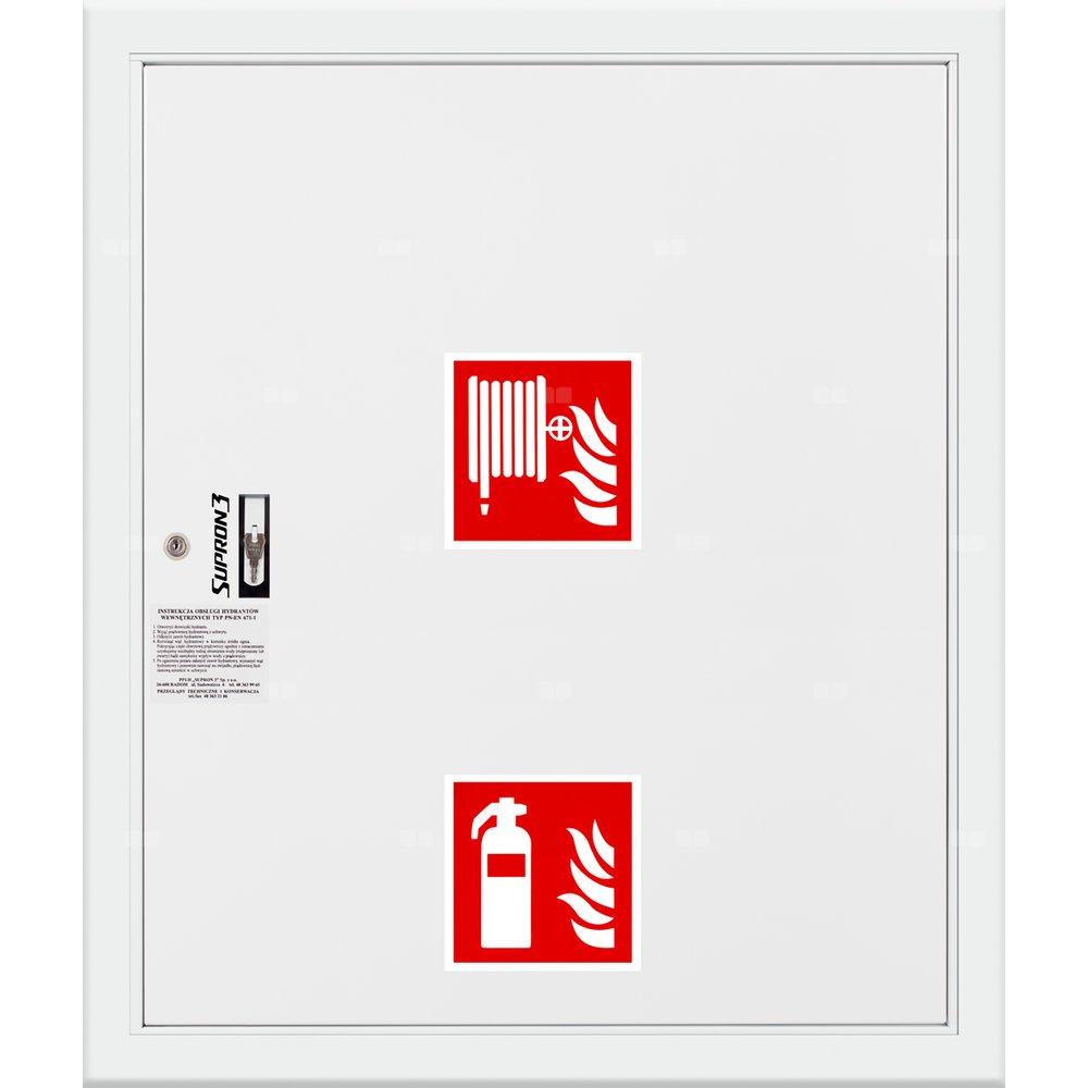 - szafka hydrantowa STANDARD wykonana z blachy czarnej malowanej farbą proszkową poliestrową fasadową typ Facade w kolorze czerwonym (RAL 3000) lub białym (RAL 9003), drzwi pełne; dzięki zastosowaniu zawiasu krytego drzwi szafki można otworzyć o 180°