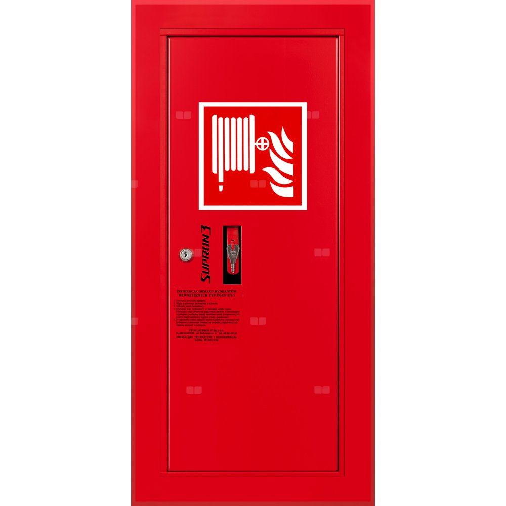 - szafka hydrantowa STANDARD wykonana z blachy czarnej malowanej farbą proszkową poliestrową fasadową typ Facade w kolorze czerwonym (RAL 3000) lub białym (RAL 9003), drzwi pełne; dzięki zastosowaniu zawiasu krytego drzwi szafki można otworzyć o 180°