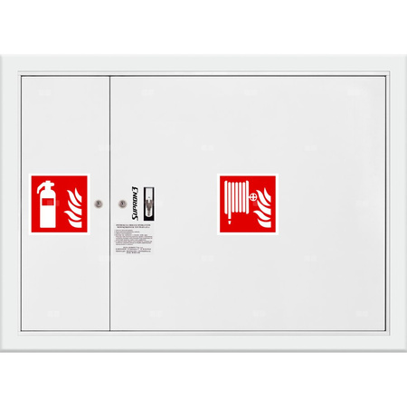 - szafka hydrantowa STANDARD wykonana z blachy czarnej malowanej farbą proszkową poliestrową fasadową typ Facade w kolorze czerwonym (RAL 3000) lub białym (RAL 9003), drzwi pełne; dzięki zastosowaniu zawiasu krytego drzwi szafki można otworzyć o 180°