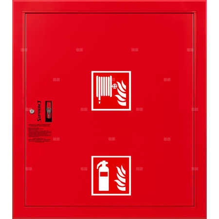 - szafka hydrantowa STANDARD wykonana z blachy czarnej malowanej farbą proszkową poliestrową fasadową typ Facade w kolorze czerwonym (RAL 3000) lub białym (RAL 9003), drzwi pełne; dzięki zastosowaniu zawiasu krytego drzwi szafki można otworzyć o 180°