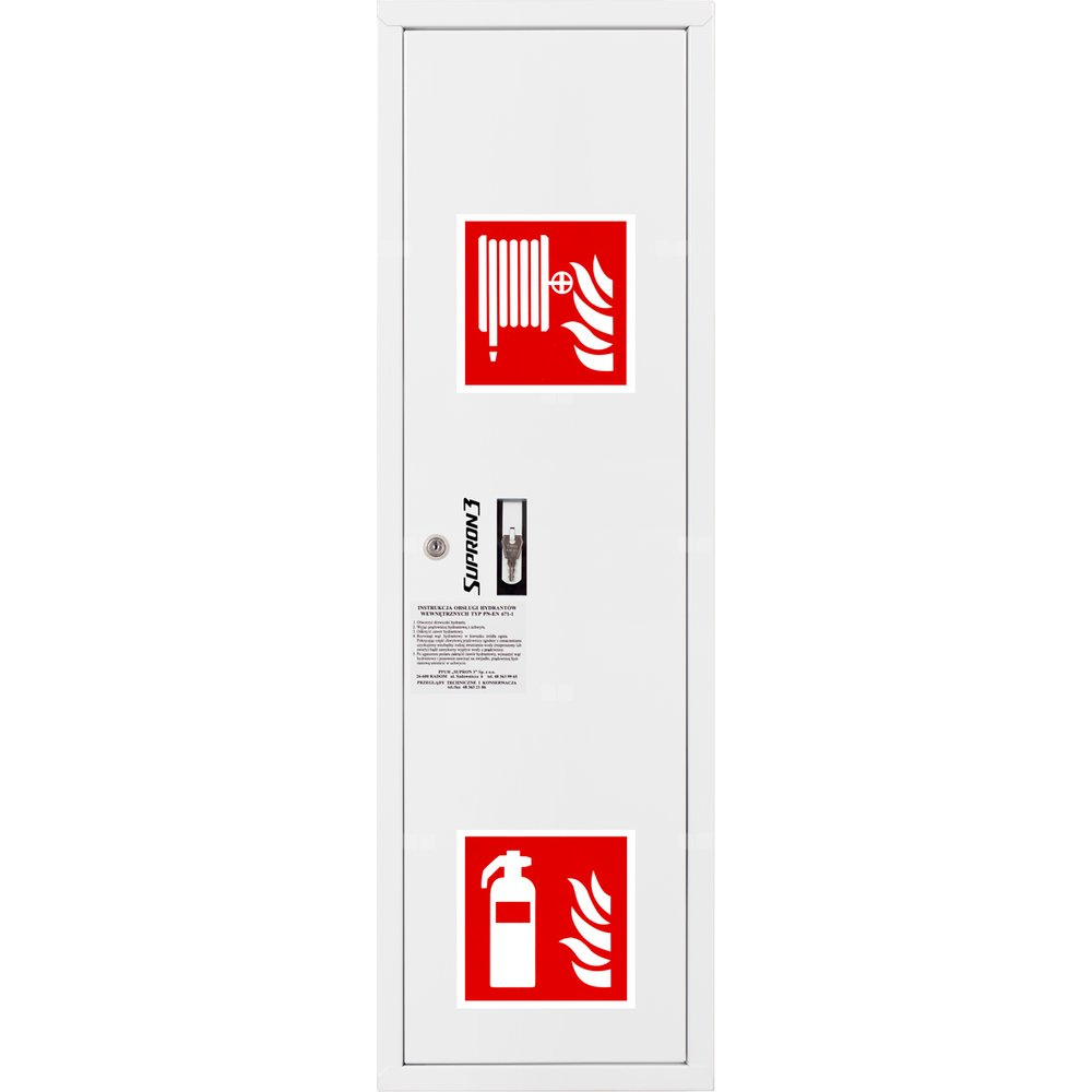 - szafka hydrantowa STANDARD wykonana z blachy czarnej malowanej farbą proszkową poliestrową fasadową typ Facade w kolorze czerwonym (RAL 3000) lub białym (RAL 9003), drzwi pełne; dzięki zastosowaniu zawiasu krytego drzwi szafki można otworzyć o 180°