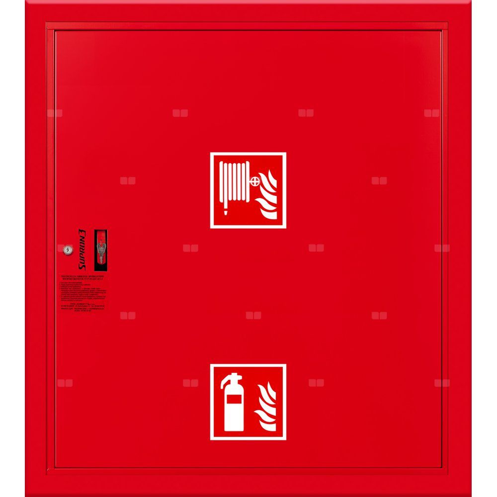 - szafka hydrantowa OCYNKOWANA wykonana z blachy stalowej ocynkowanej elektrolitycznie malowanej farbą proszkową poliestrową fasadową typu Facade w kolorze czerwonym (RAL 3000) lub białym (RAL 9003), drzwi pełne; dzięki zastosowaniu zawiasu krytego drzwi szafki można otworzyć o 180°