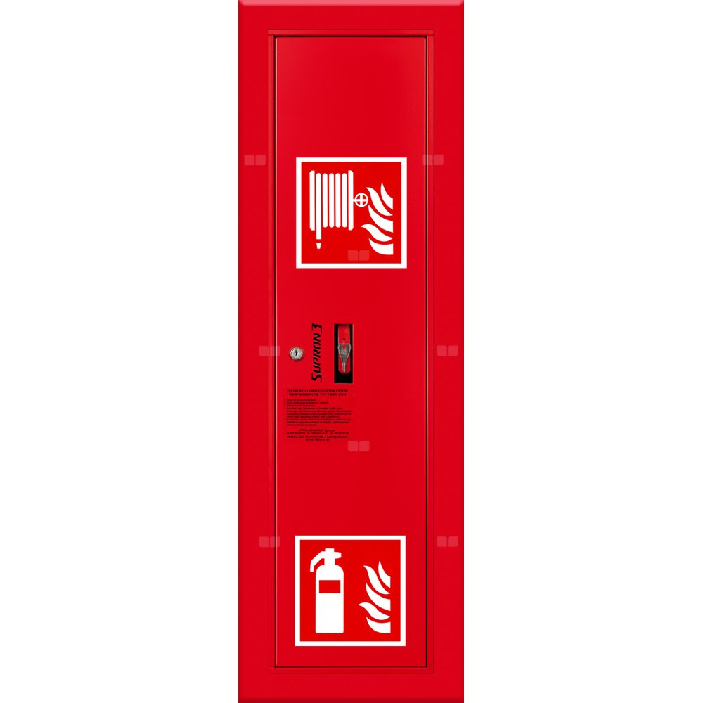 Hydrant DN 52 wnękowy boczny z koszem, z miejscem na gaśnicę, wąż 15 m, zamek patent, RAL 3000 prawy